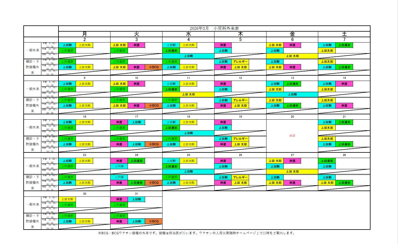 小児科外来診察時間・担当医のお知らせ※2026年3月分